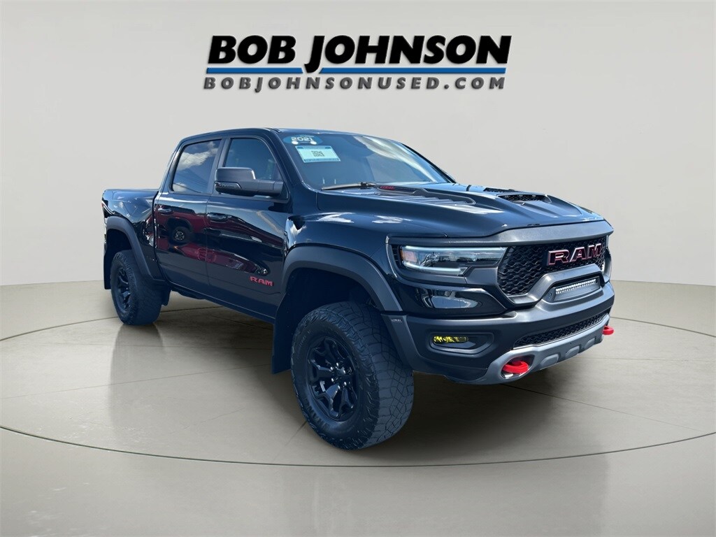 Experience the thrill of power and precision in this 2021 Ram 1500 TRX, a rugged behemoth that blends brawn with refined luxury. From the moment you slide into the leather-trimmed bucket seats and grip the leather/suede flat-bottom steering wheel, youll feel the immediacy of the driver-focused cockpit, complete with a premium wrapped IP bezel and illuminated ambient lighting that sets the mood for every drive. The 6.2L supercharged HEMI V8 roars to life through the Diamond Black Crystal Pearlcoat finish, delivering standout acceleration and a commanding on-road presence, while the eight-speed automatic transmission and 4WD capability ensure confident handling in any terrain. Practical luxury meets capability with features like a full bed protection packageMOPAR spray-in bedliner, deployable bed step, and four adjustable cargo tie-downsplus trailer readiness with Trailer Tow Group, brake control, and tire pressure monitoring. Comfort isnt sacrificed for power, thanks to heated front seats, a heated steering wheel, power 8-way comfort seating, power adjustable pedals, and driver/passenger lumbar support, all illuminated by thoughtful details like IP LED ambient light piping and front/rear door accent lighting. The TRXs smart tech package includes a navigation system, universal garage opener, and a comprehensive lighting and storage suite (rear underseat storage and rear window defroster) to keep every ride practical and organized. The result is a vehicle that begs to be drivenwhether youre carving corners on a back road or towing with confidencemaking every trip feel purpose-built for excitement.